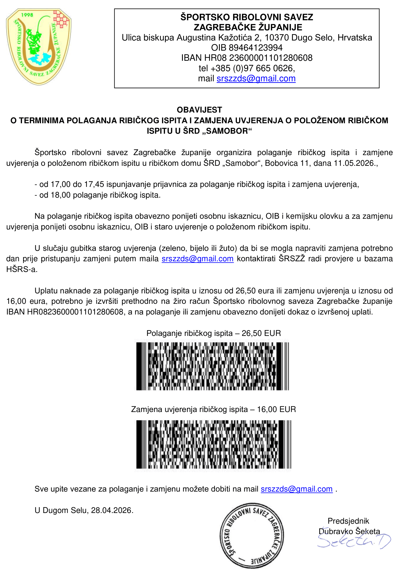 POLAGANJE I ZAMJENA RIBIČKOG ISPITA U ŠRD "SAMOBOR" 11.05.2026.